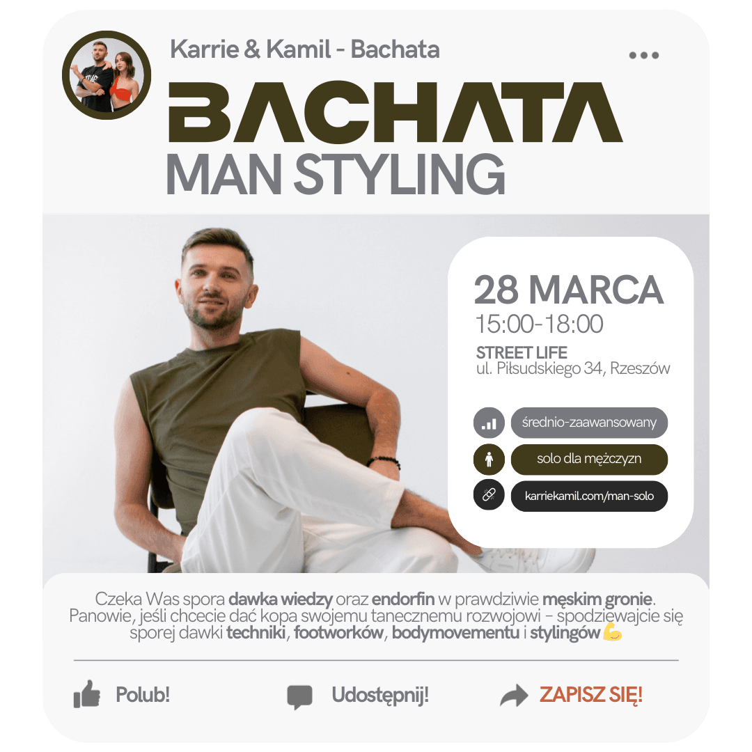 Zapraszamy Was na trzy godziny bachatowego wycisku pod okiem Kamila. Czeka Was spora dawka wiedzy oraz endorfin w prawdziwie męskim gronie 😎